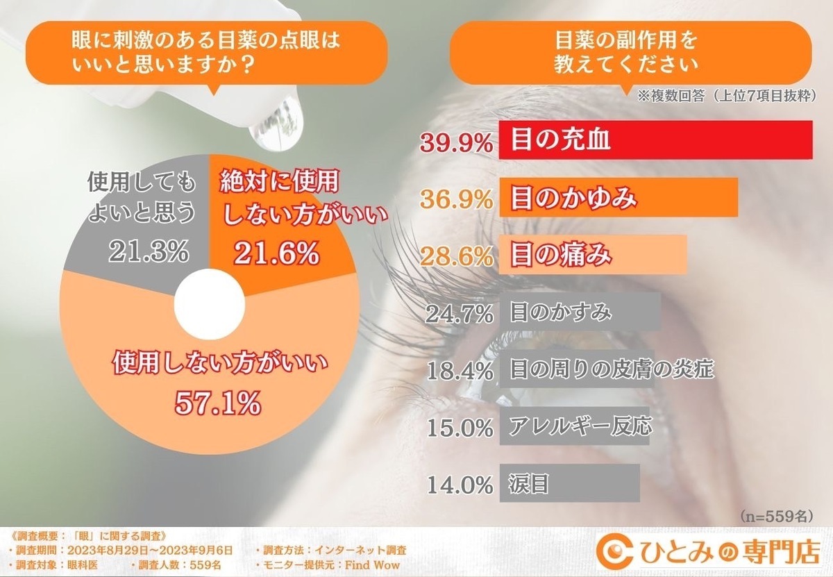 健康長寿は、「目薬と洗眼剤」に関する調査結果を10月4日に発表した。調査は2023年8月29日〜9月6日の期間、全国の眼科医559名を対象にインターネットで行われた。