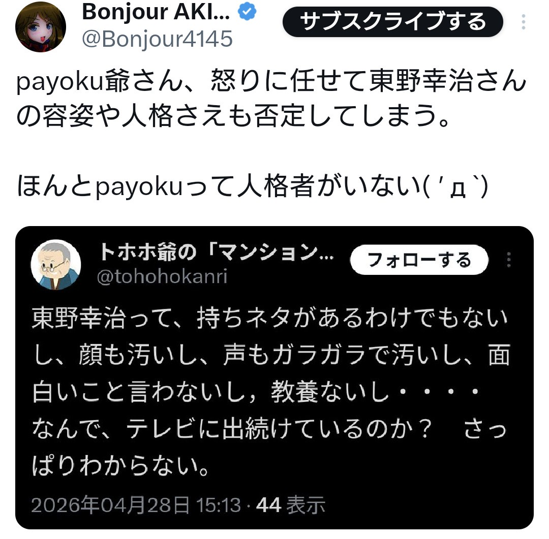 payoku爺さん、怒りに任せて東野幸治さんの容姿や人格さえも否定してしまう。